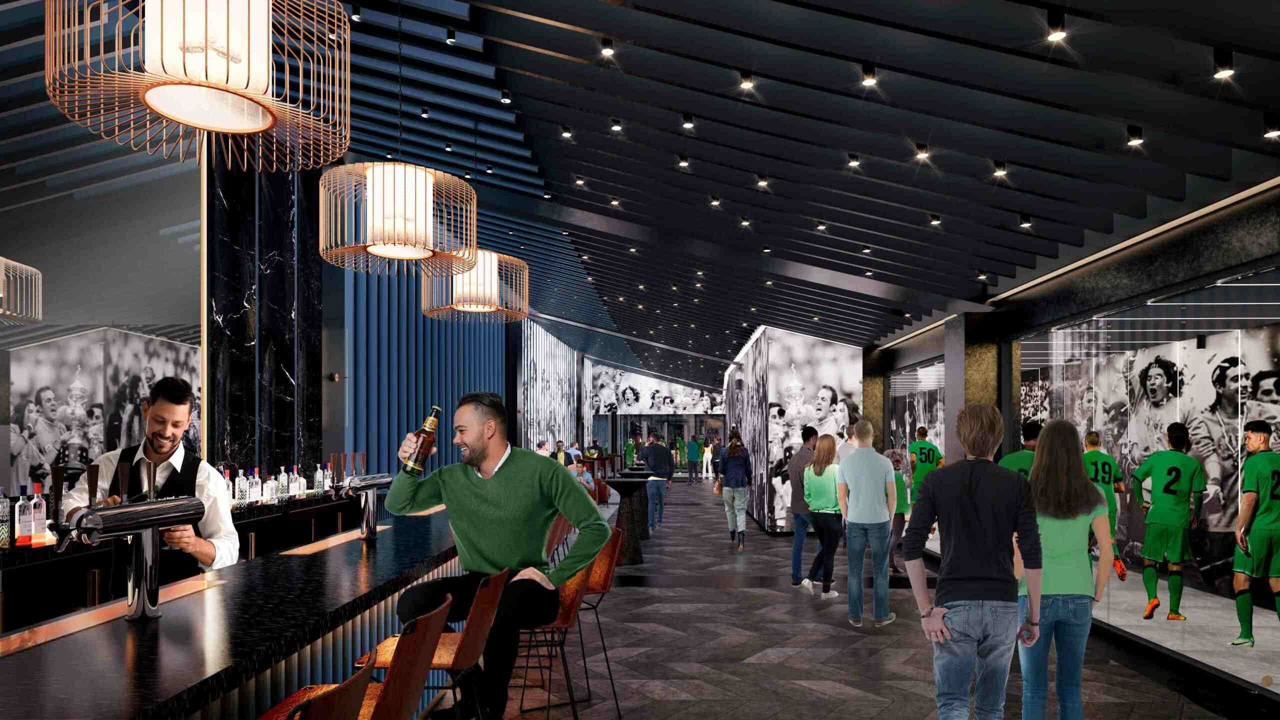 El espacio interior del club ofrece una amplia área abierta con asientos en el bar y el lounge, con vistas a la entrada de los jugadores al campo.